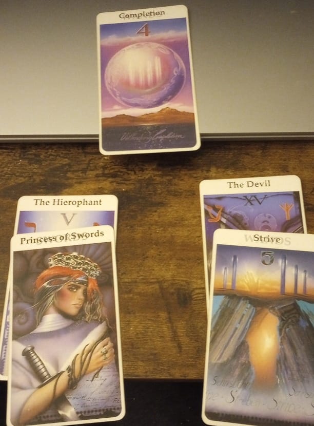 Heavy. But I needed more to make sense of it, pulling the Princess of Swords and 5 of Wands. The Princess who holds to an internal conviction of what is right and proper in the face of those who argue otherwise, and the confusion of the 5 that can nonetheless be overcome by striving toward higher principle.